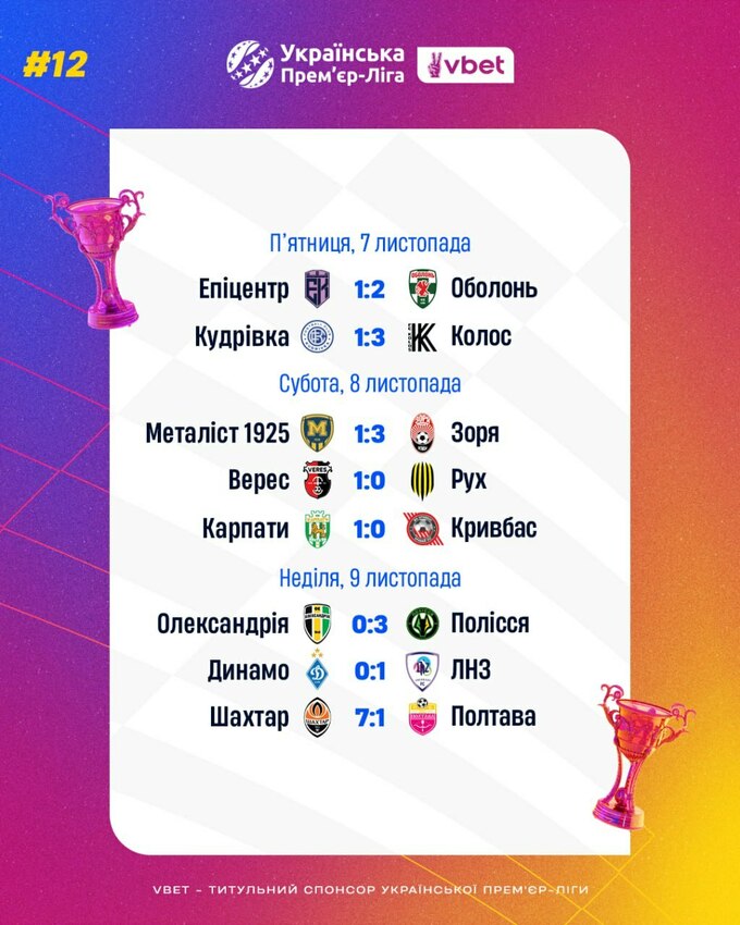 З 7 до 9 листопада пройшов 12-й тур Української Прем’єр-ліги 2025/26. додано (42 Секунди) :