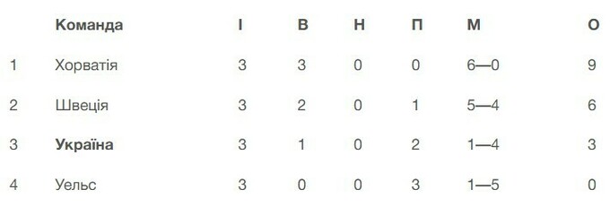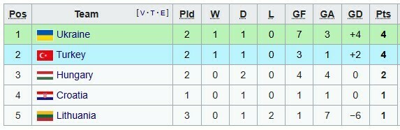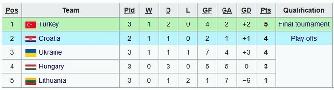 Становище у групі: Туреччина (5 очок), Хорватія, Україна (по 4), Угорщина (3), Литва (1).