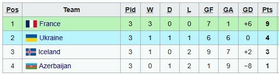 Ситуація у групі: Франція (9 очок), Україна (4), Ісландія (3), Азербайджан (1).